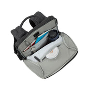 Despite being compact, the bag offers a huge amount of space. It has a central Laptop section, a zippered compartment with a pocket for documents, two further zippered pockets and a pocket for a bottle or an umbrella. It also comes with a front zippered pocket that stores accessories, portable battery, business cards, pens and smartphones.