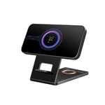 The Sandberg 3-in-1 Wireless Charger Stand allows you to charge your smartphone, Airpods and smartwatch wirelessly and simultaneously. The smartphone charging plate is magnetic and can therefore be attached to iPhones with MagSafe. Other Qi-compatible telephones can also be charged on the charging pad. Simply place them on the small fold-out holder. The entire stand can be folded up and easily taken along on the go.